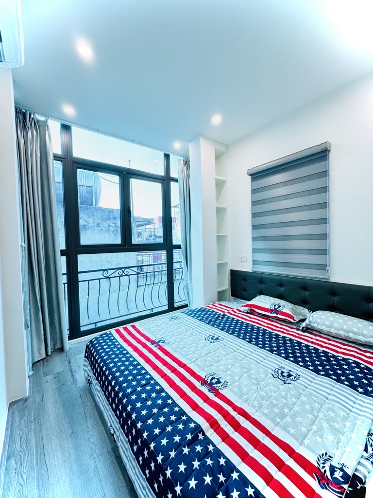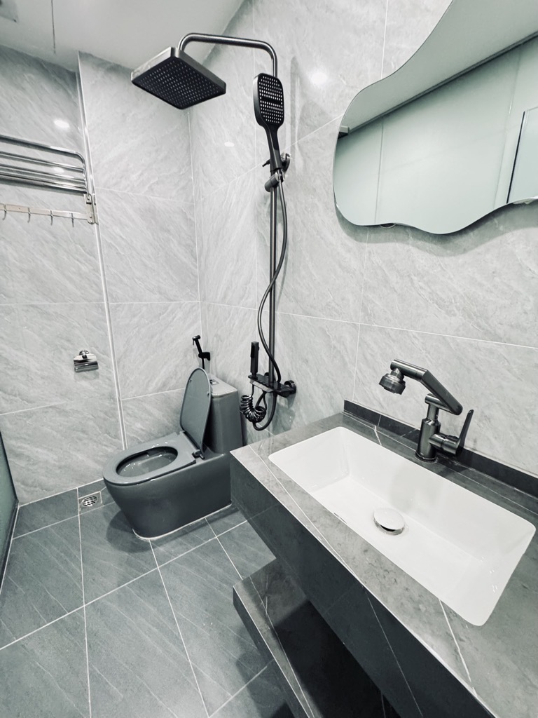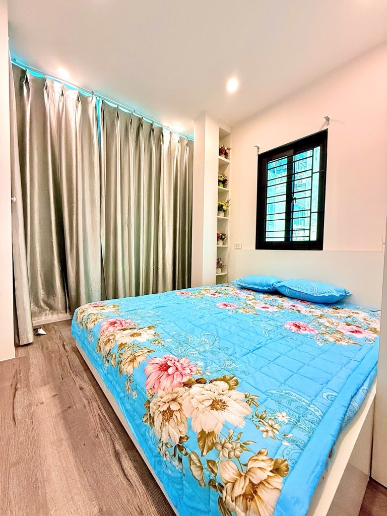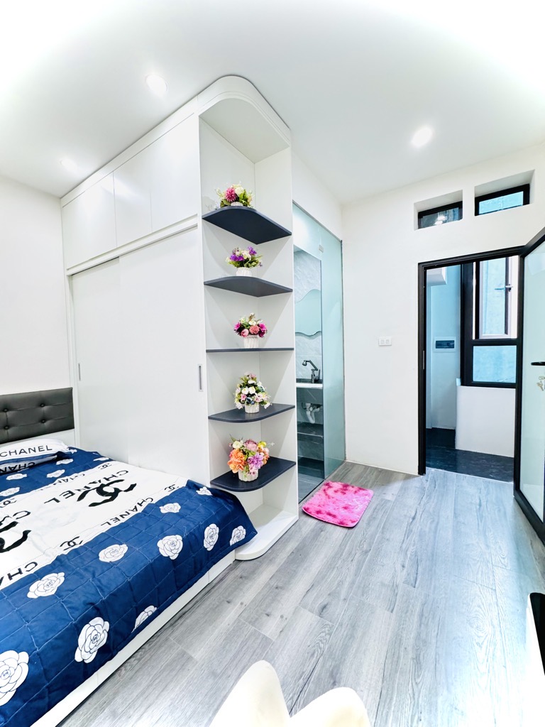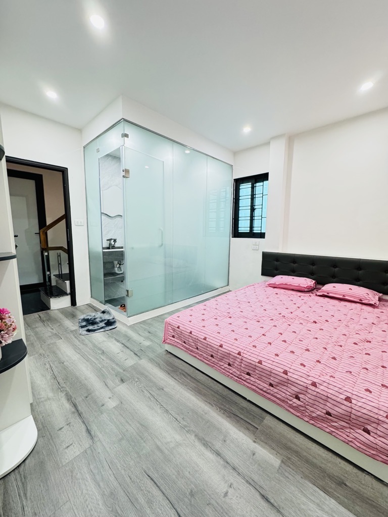 Thiết kế: Diện tích 30m tầng 1 nhưng từ tầng 2 đua ra 38m2, cầu thang giữa 5 ngủ + wc khép kín các phòng