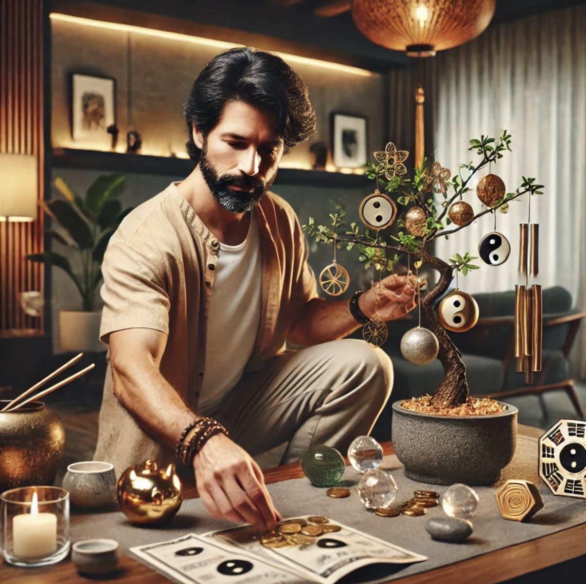Hình ảnh minh hoạ tuổi Canh Thân đang sắp xêp vật phẩm phong thuỷ cho căn hộ chung cư